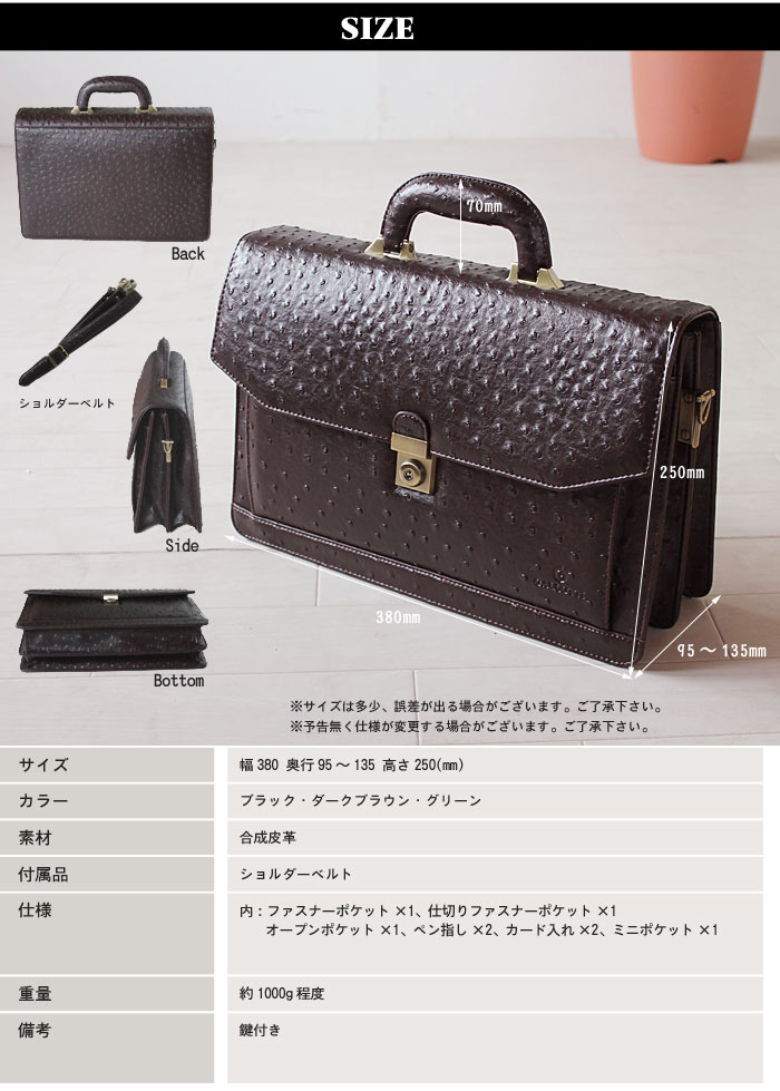 父の日 就職活動 就活 面接 新卒 買い替え プレゼントに ■本物と見違えるほどの仕上がり!?オーストリッチ風型押しビジネスバッグ ■サイズ:幅380 奥行95〜135 高さ250(mm) ■素材:合成皮革 ■仕様内装:ファスナーポケット×1、仕切りファスナーポケット×1、オープンポケット×1、ペン指し×2、カード入れ×2、ミニポケット×1 ■カラー:ブラック・ダークブラウン・グリーン ■付属品:ショルダーベルト ■備考:鍵付き ■重量:約1000g程度 ■納期:約7〜10日程度 ※モデルチェンジの為、レビュー内容と異なる場合がございます ※北海道、九州、沖縄、離島に関しては別途送料が必要となります。