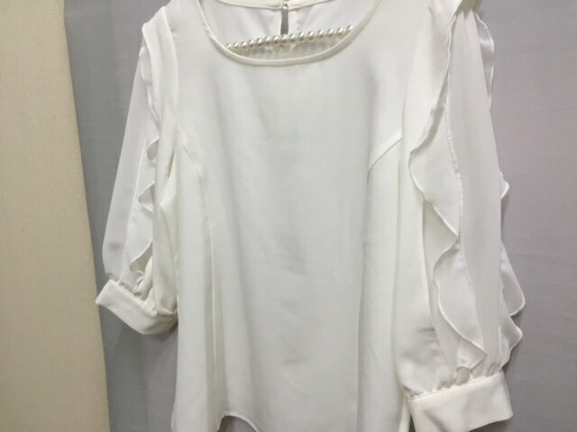 【サイズ】M (着丈52CM 身幅46CM袖丈39CM) ※サイズ寸法誤差は御了承下さい 【素材】ポリエステル100%袖フリルがトレンドのお洒落なブラウスです。