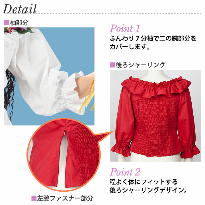 サイズ表/cm ( )内はヌード寸法 サイズ バスト 袖丈 身丈 M 88(79〜87) 48 47 L 95(86〜94) 48 48 LL 102(93〜101) 48 49 3L 110(100〜108) 49 51 衣装/ステージ/舞台/イベント/ライブ/発表会/ハワイアン/フラトップ/フラダンス/パウブラウス/