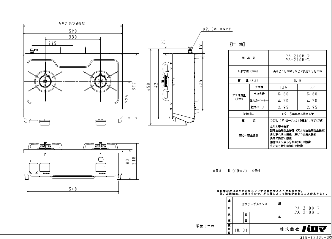 機能 コンロ機能: シールドトップ/早切れ防止機能(異常過熱防止)/高温炒め機能 安心・安全機能: さらに安心モード/点火確認カラーサイン/中火点火(強火力側)/コンロ消し忘れ消火機能/調理油過熱防止装置(全口)/立消え安全装置/焦げつき消火機能 仕様 メーカーパロマ 型番PA-210B-R(右強火力)/PA-210B-L(左強火力) トッププレート/カラーホーロートップ:チャコール 外形寸法 [mm]幅592×奥行458×高さ180mm 質量 [kg]6.6 ガス接続/電源9.5mmΦガス用ゴム管/アルカリ乾電池:単1×2個 ガス消費量[Kw]全点火時6.80/強火力4.20/標準2.95 この商品について 接続には、ガスホースが必要です。